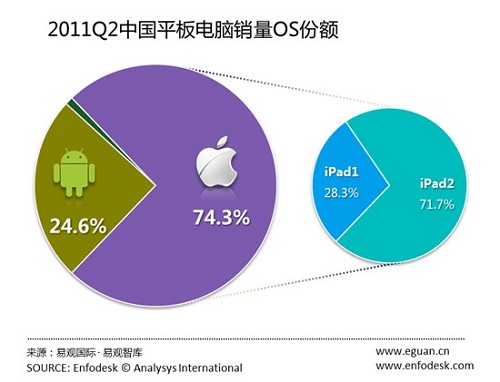 2011年第2季度中國市場銷售的平板電腦中,iOS系統(tǒng)占比最高,Android系統(tǒng)雖然產(chǎn)品數(shù)量占優(yōu),但占比僅有24.64%。