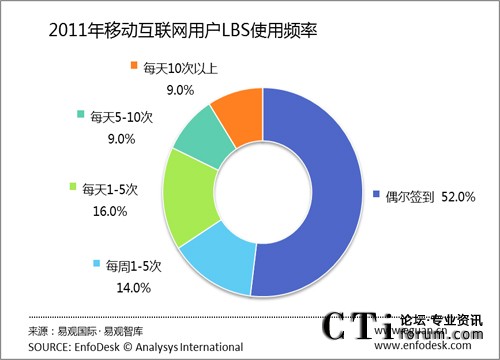 CTI論壇(ctiforum)8月26日消息(記者 張潔):根據(jù)易觀國(guó)際(Analysys international)最新調(diào)研顯示,42%的使用LBS用戶(hù)認(rèn)為使用應(yīng)用程序可以方便生活,17%的用戶(hù)認(rèn)為是社交需求,15%的用戶(hù)只是出于追趕潮流的目的,11%的用戶(hù)認(rèn)為使用LBS應(yīng)用程序可以獲得一定的優(yōu)惠。