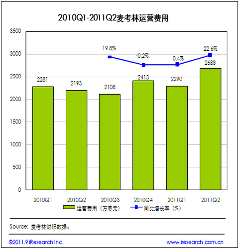 2011Q2麥考林運(yùn)營費(fèi)用為2688萬美元,同比增加22.6%。據(jù)麥考林CFO披露,2011Q2市場(chǎng)營銷費(fèi)用收入的比例為14%,即822萬美元(2011Q1市場(chǎng)營銷費(fèi)用收入比例為13%,即625萬美元,且60%用于線上渠道,40%用于呼叫中心渠道),行政與管理費(fèi)用達(dá)到1774萬美元的水平。