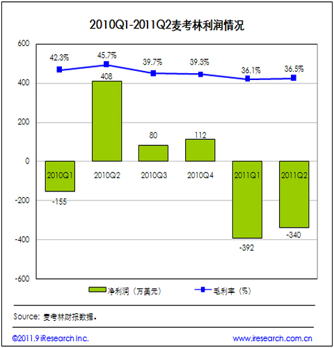 2011Q2麥考林整體毛利率為36.5%,2010年同期為45.7%;2011Q2凈虧損340萬美元,2010年同期凈利潤為410萬美元。