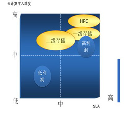 從企業(yè)戰(zhàn)略咨詢分析師的角度,我認為IBM的戰(zhàn)略布局和資源整合策略確實是IT領域戰(zhàn)略規(guī)劃很好的教科書(起碼對于我個人而言)。精準的定位市場、以具有明顯技術細分優(yōu)勢的產品或服務切入市場、設定較高的技術準入門檻,這些戰(zhàn)略舉措不僅有助于IBM快速占領新生市場戰(zhàn)略制高點,同時保證了其可持續(xù)競爭優(yōu)勢和利潤空間。從下面的云計算準入/云服務SLA象限圖上,當很多廠商還在考慮“哪塊云彩有雨”時,IBM已經完成在云端提供HPC和高增值二級存儲服務的布局,掌控了利潤最豐厚的云計算高端市場。從我個人的預測,IBM在云端提供一級存儲服務,應該是其云計算高端戰(zhàn)略的下一個布局。