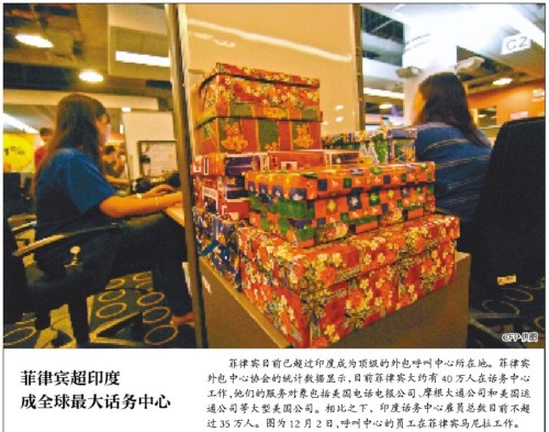 菲律賓目前已超過印度成為頂級的外包呼叫中心所在地。菲律賓外包中心協(xié)會(huì)的統(tǒng)計(jì)數(shù)據(jù)顯示,目前菲律賓大約有40萬人在話務(wù)中心工作,他們的服務(wù)對象包括美國電話電報(bào)公司、摩根大通公司和美國運(yùn)通公司等大型美國公司。相比之下,印度話務(wù)中心雇員總數(shù)目前不超過35萬人。