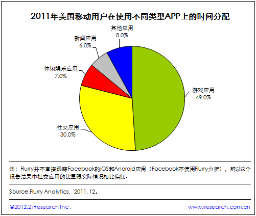 iResearch艾瑞咨詢整理Flurry最新的研究數(shù)據(jù)發(fā)現(xiàn),2011年美國(guó)移動(dòng)用戶花在游戲應(yīng)用上的時(shí)間最長(zhǎng),游戲應(yīng)用占據(jù)美國(guó)移動(dòng)用戶應(yīng)用使用總時(shí)間的49.0%,其次是社交網(wǎng)絡(luò)應(yīng)用,占30.0%,休閑娛樂(lè)應(yīng)用和新聞?lì)悜?yīng)用分別為7.0%和6.0%,剩下的其他類型應(yīng)用占據(jù)8.0%。