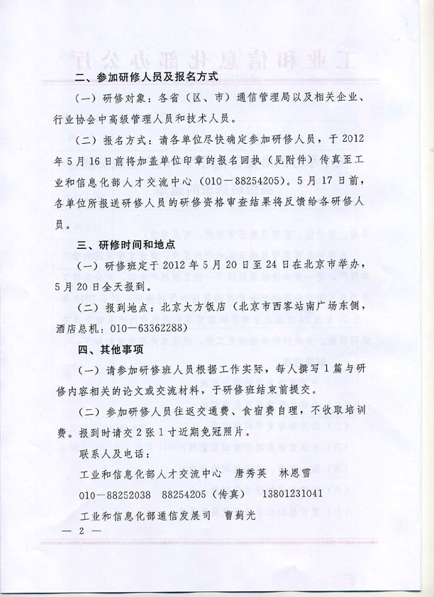 報名方式:請各單位盡快確定參加研修人員,于2012年5月16日前將加蓋單位印章的報名回執(zhí)(附后)傳真至工業(yè)和信息化部人才交流中心(010-88254205)。5月17日前,各單位所報送研修人員的研修資格審查結(jié)果將反饋給各研修人員。