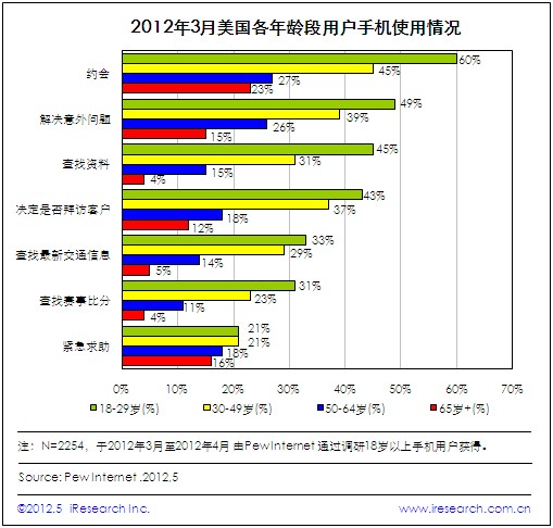 iResearch艾瑞咨詢根據(jù)Pew Internet 2012年5月發(fā)布的數(shù)據(jù)整理發(fā)現(xiàn),美國各年齡段手機(jī)用戶中,18-29歲的用戶使用手機(jī)程度最為頻繁,主要用于“約會”“解決意外問題”及“查找資料”上。相比其他年齡段用戶群,年輕用戶更偏向利用移動(dòng)手機(jī)來獲取信息。