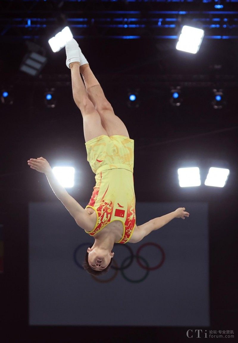 8月2日,中國選手王梓賽在比賽中。當(dāng)日,巴黎奧運會蹦床項目男子預(yù)賽在貝爾西體育館舉行。新華社記者 曹燦 攝