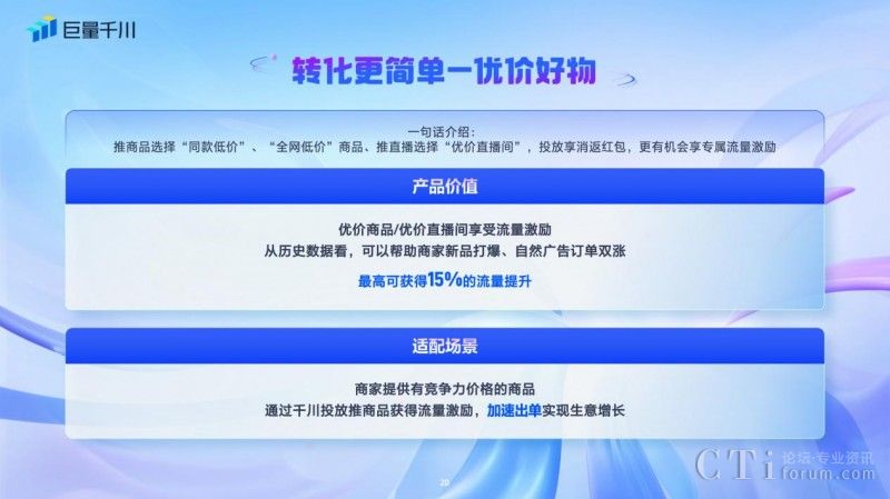 提升用戶的購(gòu)買體驗(yàn)也是商家的關(guān)注點(diǎn),隨著消費(fèi)者購(gòu)物習(xí)慣的不斷變化,94%的消費(fèi)者在購(gòu)物時(shí)有比價(jià)的習(xí)慣,因此商家在激勵(lì)的競(jìng)爭(zhēng)下提供有競(jìng)爭(zhēng)力的商品疊加穩(wěn)定的價(jià)格體系,是實(shí)現(xiàn)有效經(jīng)營(yíng)和提升用戶體驗(yàn)的關(guān)鍵。為更好的滿足商家需求,讓好產(chǎn)品被更多的人看到,具有價(jià)格力的「優(yōu)價(jià)好物」,會(huì)為商家增長(zhǎng)帶來新動(dòng)力,讓轉(zhuǎn)化變得更簡(jiǎn)單。