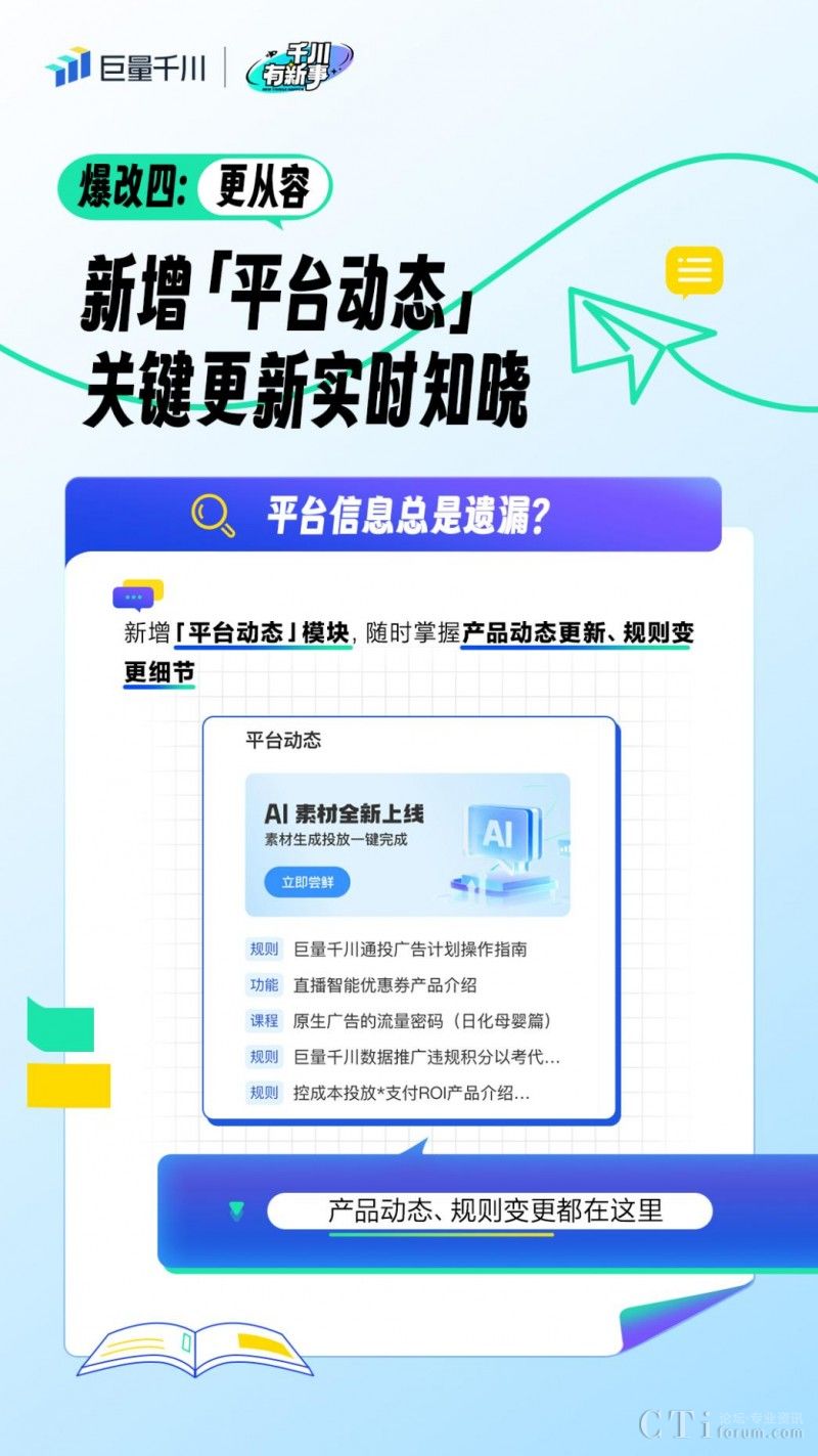 巨量千川首頁升級還增設(shè)了「平臺動態(tài)」模塊,實時呈現(xiàn)平臺產(chǎn)品更新、規(guī)則變更等信息,讓商家可以及時了解平臺最新動態(tài),把握生意增長機遇。