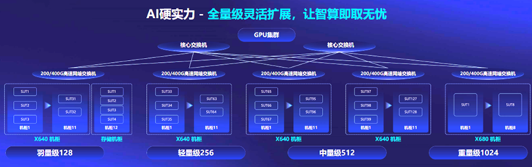 隨著算力成為稀缺資源,寧暢從客戶角度出發(fā),提供了“先享后付”的算力購買方案。目前,寧暢AI算力棧已開放免費(fèi)試用,現(xiàn)已有50+用戶預(yù)約試用。該算力棧是一個包括128臺GPU服務(wù)器的千卡級別算力集群,標(biāo)準(zhǔn)化智算中心建設(shè)方案囊括了羽量級128、輕量級256、中量級512、重量級1024四個等級,實現(xiàn)全量級靈活擴(kuò)展,給了用戶極大選擇空間。用戶可在試用中嘗試不同的業(yè)務(wù)組合、方案框架,以便找到“最優(yōu)性價比”的智算中心建設(shè)方案。