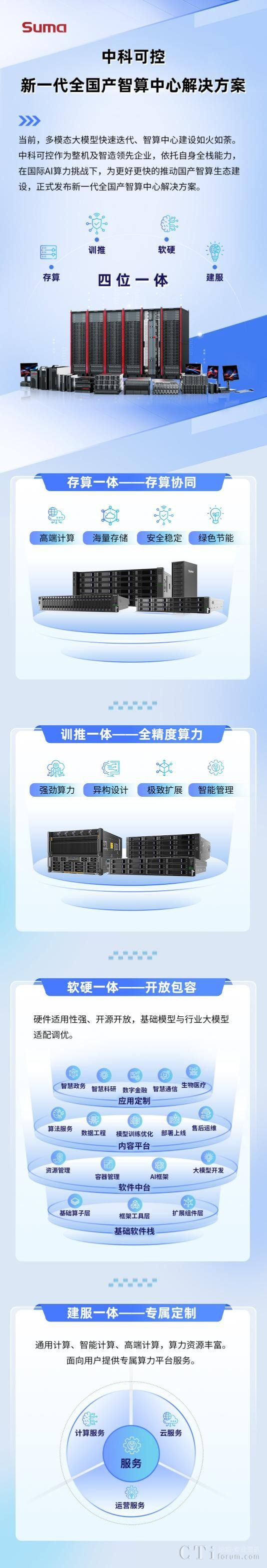 作為整機及智造領(lǐng)先企業(yè),中科可控一直堅持國產(chǎn)自主路線,結(jié)合當下行業(yè)對于AI技術(shù)的需求,在原有通用解決方案的基礎(chǔ)上,全面推出新一代全國產(chǎn)智算中心解決方案。該方案通過“存算+訓(xùn)推+軟硬+建服”四位一體的理念,推動國產(chǎn)智算生態(tài)建設(shè),賦能千行百業(yè)數(shù)智化轉(zhuǎn)型。
