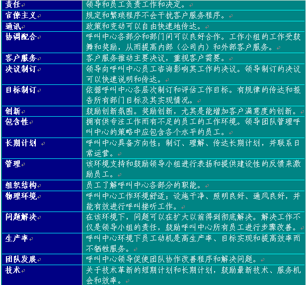 附錄6提供了建議的員工滿意度調(diào)查表。可以作為準(zhǔn)備制訂呼叫中心使用的版本的起點(diǎn)。在制訂表格時(shí),應(yīng)從所有中心最佳實(shí)踐工作和領(lǐng)導(dǎo)團(tuán)隊(duì)確認(rèn)的其他部門取得評(píng)估要素。表格6總結(jié)了呼叫中心員工滿意度調(diào)查應(yīng)包含的主要方面: