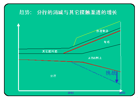 。。下圖為國外專家對銀行不同客戶服務(wù)渠道發(fā)展比例的說明。可以看到,營業(yè)廳的比例在逐年下降,而國外不少銀行甚至將進一步壓縮營業(yè)廳比例作為一項渠道的任務(wù)。電話銀行也就是通過IVR實現(xiàn)的自助服務(wù),自然是呼叫中心的一部分,但人工服務(wù),包括對上網(wǎng)及其它互動方式的客戶提供的座席代表服務(wù),當(dāng)然更是現(xiàn)代呼叫中心業(yè)務(wù)的一部分,圖上雙紅線內(nèi)所表示的正是不斷發(fā)展的呼叫中心的所占比例。
