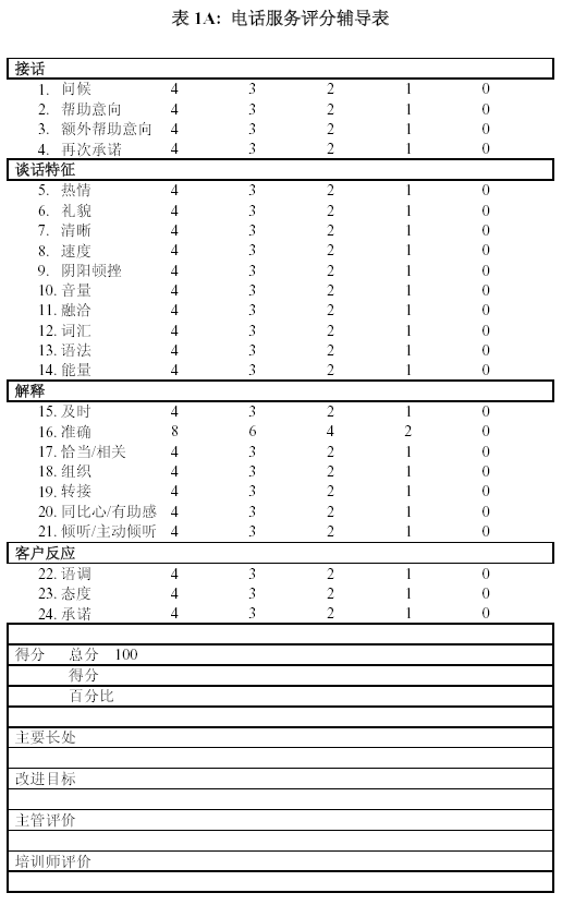 。。無(wú)論是客戶服務(wù)還是電話銷售, 輔導(dǎo)表所測(cè)定的內(nèi)容一定要和培訓(xùn)內(nèi)容一致起來(lái). 沒(méi)有培訓(xùn)過(guò)的項(xiàng)目, 不要要求座席代表自行理解.