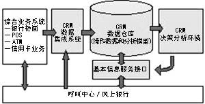 銀行CRM系統(tǒng)一般由業(yè)務處理、客戶聯(lián)系和客戶關系分析中心三部分組成。業(yè)務處理部分指銀行的綜合業(yè)務處理系統(tǒng),包括柜面業(yè)務系統(tǒng)、信用卡系統(tǒng)、POS機和ATM機等;客戶聯(lián)系部分由呼叫中心和網(wǎng)上銀行組成;客戶關系分析中心則以CRM中心數(shù)據(jù)倉庫為核心,通過數(shù)據(jù)集成系統(tǒng)與業(yè)務處理部分連接,同時為銀行的管理層和業(yè)務分析人員提供客戶分析系統(tǒng)。
