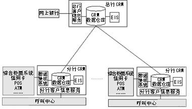 由于銀行在各地建有大量的分支機構,銀行CRM系統(tǒng)一般都采用分布式數(shù)據(jù)倉庫環(huán)境,即所有分行均擁有自己的CRM系統(tǒng),并與本地綜合業(yè)務系統(tǒng)及呼叫中心連接。在總行建有中心CRM數(shù)據(jù)倉庫,提供面向全行的分析決策功能,并為網(wǎng)上銀行業(yè)務提供數(shù)據(jù)查詢支持。