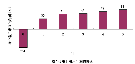 以信用卡服務(wù)為例,爭取一個新的用戶平均要51美圓,用于廣告、推銷和開戶等開支。用戶開始時花錢很少,但為公司帶來一定的利潤。但如果用戶繼續(xù)使用到第二年,就會為公司帶來更多的經(jīng)濟效益,因為公司與客戶之間的信任和客戶對公司的滿意,致使客戶更多地通過信用卡消費。(圖:"信用卡用戶產(chǎn)生的價值")用戶貢獻在增加,公司的運作費用卻在不斷減低。信用卡公司可以不斷減少對客戶信用的審核時間。保持長期的客戶關(guān)系,還可以減少廣告支出,客戶本身就是一個免費的廣告資源。很多人在消費前喜歡聽取朋友的意見,覺得比廣告更可信。
