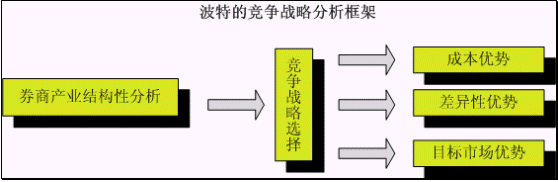 上圖為利用哈佛著名教授邁克爾o波特的競(jìng)爭(zhēng)戰(zhàn)略分析框架來(lái)分析證券營(yíng)業(yè)部的競(jìng)爭(zhēng)戰(zhàn)略。由于此文的著眼點(diǎn)是以證券營(yíng)業(yè)部為中心的產(chǎn)業(yè),也就是證券公司的經(jīng)紀(jì)業(yè)務(wù)產(chǎn)業(yè),而證券公司的其他金融服務(wù)項(xiàng)目如投資、自營(yíng)等業(yè)務(wù)不在本文討論的范疇。