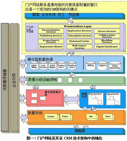 圖一向我們展示了一種CRM技術架構,它以Web門戶網(wǎng)站作為客戶、合作伙伴、員工和供應商之間的通路,并以此作為它的主要特征。
