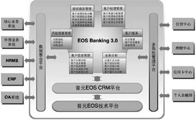 與市場上大多數(shù)銀行客戶經(jīng)理軟件產(chǎn)品和CRM產(chǎn)品所不同的是,普元的EOS Banking是構(gòu)建于普元獨有版權(quán)的EOS(Enterprise Operating System,企業(yè)級運營系統(tǒng))平臺之上。