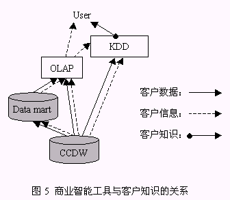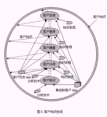 從以上構(gòu)成系統(tǒng)的三個(gè)組件的介紹中同時(shí)可以找到對(duì)以下兩個(gè)問題的答案:1、客戶數(shù)據(jù)、客戶信息、客戶知識(shí)之間的區(qū)別(圖5):由來自于事務(wù)系統(tǒng),如ERP、SFA等的源數(shù)據(jù)經(jīng)整理后放入CCDW或數(shù)據(jù)集市,這一過程處理的對(duì)象稱為客戶數(shù)據(jù);OLAP為決策人員提供了展示有意義的客戶數(shù)據(jù)的機(jī)制,這種有意義的客戶數(shù)據(jù)稱之為客戶信息;客戶數(shù)據(jù)和客戶信息均可以通過KDD技術(shù)的運(yùn)用,提升為對(duì)決策有價(jià)值的客戶知識(shí)。2、客戶知識(shí)生成的途徑:從對(duì)第一個(gè)問題的解答中可以知道,客戶知識(shí)從KDD作用的對(duì)象來看有兩種途徑:KDD作用于客戶數(shù)據(jù)、KDD作用于客戶信息,總之,客戶知識(shí)生成是依賴于KDD過程的復(fù)雜的過程。