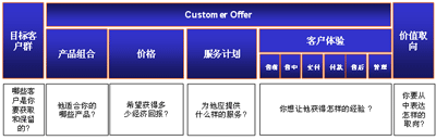 造成這樣的結(jié)果, 關(guān)鍵在于僅僅用產(chǎn)品或服務(wù), 無(wú)法表達(dá)出客戶(hù)對(duì)企業(yè)完整的價(jià)值取向. 我們還需要更豐富的管理理念來(lái)表達(dá)出企業(yè)對(duì)客戶(hù)所有的價(jià)值提供. 這一概念其實(shí)早已由埃森哲提出, 我們稱(chēng)之為”Customer Offer”. 其內(nèi)涵在國(guó)內(nèi)的實(shí)際項(xiàng)目中已經(jīng)得到實(shí)踐的檢驗(yàn), 并取得良好的效果(該項(xiàng)目為某國(guó)內(nèi)領(lǐng)先的電信運(yùn)營(yíng)企業(yè)的CRM項(xiàng)目, 于2003年底完成).