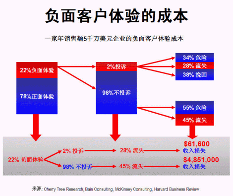 一家年銷售額五千萬美元的企業(yè),假設(shè)正面客戶體驗為78%,負面體驗為22%,在所有負面體驗中,只有2%的客戶投訴,其余98%大多數(shù)均不投訴,保持沉默(這與現(xiàn)實情況頗為吻合)。在2%投訴客戶中,有34%經(jīng)過處理仍然未能令客戶完全滿意,尚有流失的危險;28%的客戶在處理后依然流失,余下38%的客戶則感到滿意,繼續(xù)留下。對大部分(98%)沒有投訴的客戶,因公司對他們的不滿意并不知情,所以沒有采取行動,55%的客戶有隨時流失的危險,其余45%已經(jīng)流失。