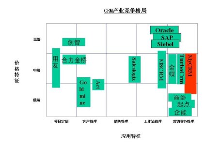 伴隨著中國CRM市場的逐步繁榮,CRM產(chǎn)業(yè)競爭格局已然悄然改變。國內廠商的更替變化,國外廠商的步步進逼,一幕幕不斷上演。變化的背后,沒有顯見的是激烈競爭角逐;改變帶來的亦是對市場發(fā)展的積極推動。記得,在2005年以前,在市場中活躍的廠商基本都是中國本土的,而且總是那幾個老面孔。適者生存,中國CRM市場經(jīng)歷了6個年頭的洗禮后,現(xiàn)在的產(chǎn)業(yè)競爭格局,已經(jīng)逐步明朗起來。我個人從2個緯度來定位,即:價格特征、產(chǎn)品應用特征。從價格特征來看,有高端、中端和低端。從產(chǎn)品應用特征來看,有項目定制、客戶管理、銷售管理、工作流管理和營銷業(yè)務管理。如下圖所示。營銷業(yè)務管理則涵蓋了客戶管理、市場管理、銷售管理和服務管理的應用。目前,中國本土CRM廠商,大多數(shù)都在致力于把營銷業(yè)務管理做好。不過,從具體的產(chǎn)品功能和應用深度,以及產(chǎn)品客戶化能力方面,各廠商的優(yōu)劣勢還是非常明顯的。這也是,企業(yè)在選型CRM產(chǎn)品的時候,非常重視的一些關鍵評估指標。但是,廠商要實現(xiàn)全面的功能、深度的應用以及強大的客戶化能力,是需要付出很高的研發(fā)投入的,而且也需要較長的一段產(chǎn)品化的周期。這似乎是一個很難逾越的門檻,尤其是對于中國本土的CRM廠商來說,更是如此。因為,資金和人才資源畢竟是相當有限的。所以,眾多CRM廠商中,真正能夠獲得客戶青睞,幫助客戶實現(xiàn)企業(yè)級CRM應用的一線廠商,也許只是少有的幾家了。目前,MyCRM、saleslogix、TurboCRM以及MSCRM等,都是客戶不錯的選擇。