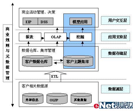 從上面的分析型CRM體系結構圖可以看出,整個架構分為數據源層、數據存儲層、應用支持層和用戶交互層總共四層。數據源層包括了企業(yè)常用信息系統(tǒng)和一些外部系統(tǒng)的數據源,比如涉及到客戶交互的一些交易系統(tǒng),服務系統(tǒng),各系統(tǒng)間的客戶數據是分散的,而且可能重合,出現不一致的問題;數據存儲層是為了整個企業(yè)有集中統(tǒng)一的客戶視圖,通過從各源系統(tǒng)抽取數據,進行整合后的數據倉庫,而且在客戶數據倉庫的基礎上,可以建立相關分析之用的客戶主題數據集市;應用支持層除了支持復雜,智能化報表查詢外,還支持OLAP分析,提供數據挖掘功能;用戶交互層提供分析和挖掘結果同企業(yè)管理、決策層和企業(yè)其它服務人員和客戶的交互,形成反饋機制,從而有效地利用分析和挖掘得到的有用知識。