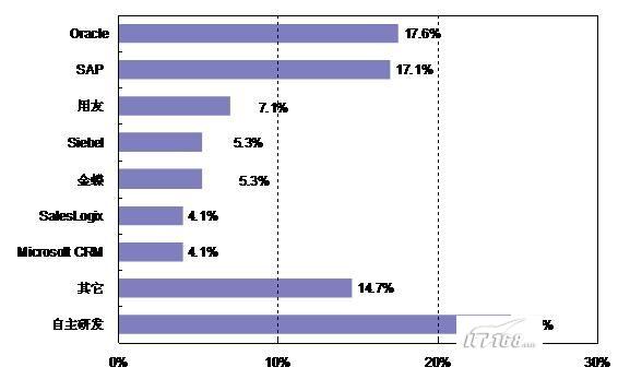 Logix(4.1%)和Microsoft CRM(4.1%)等;另有24.7%的企業(yè)是自主開(kāi)發(fā)的CRM系統(tǒng)。