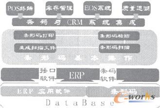 條碼技術(shù)的成熟使企業(yè)可以大范罔地得到應(yīng)用,充分解決企業(yè)管理系統(tǒng)中海量數(shù)據(jù)的管理和采集的難題,把條碼技術(shù)與CRM進(jìn)行無縫集成,為企業(yè)的ERP打下基礎(chǔ),具體集成框架圖如圖2。