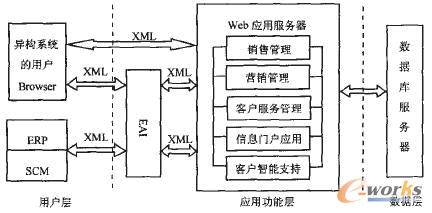 包括ERP、SCM等其他企業(yè)應用在內(nèi)的所有的系統(tǒng)用戶與應用功能層的數(shù)據(jù)交換均通過XMI數(shù)據(jù)進行傳輸,從而大大減小了各種企業(yè)應用系統(tǒng)間的通信阻力,為EAI提供了良好的通信平臺。Web用戶的客戶端只是“瘦小的”瀏覽器日_數(shù)量不受限制,不需要安裝專門的軟件,這使得凡可以接入Internet的用戶都可以方便、靈活地使用系統(tǒng),大大提升了系統(tǒng)用戶間溝通、協(xié)作的效率。此外,由于CRM應用系統(tǒng)是在中央服務器上實施和維護的,對客戶端的要求遠沒有C/S結(jié)構(gòu)那么高,集中的軟件實施和維護大大節(jié)約了企業(yè)的運行成本和維護費用。圖1描述的是筆者所要闡述的適應網(wǎng)絡(luò)環(huán)境的基于Web的系統(tǒng)平臺架構(gòu),這并不意味著CRM應用系統(tǒng)完全以這種方式運行,事實上用戶接入CRM系統(tǒng)的方式是多種多樣的,系統(tǒng)還應該提供電話、傳真、無線接入等多種接入接口。