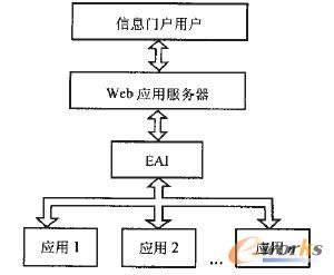 (3)用戶界面層整合。用戶獲得某項業(yè)務活動所需的信息可能需要在多個應用的不同的用戶界面來回切換,在實現(xiàn)數(shù)據(jù)層和業(yè)務功能層整合的基礎(chǔ)上,用戶界面層有必要也有可能實現(xiàn)使用統(tǒng)一界面完成應用間集成的功能。A企業(yè)信息門戶應用就是一個以用戶界面層整合為卞的整合實例,其邏輯結(jié)構(gòu)如圖3所示。