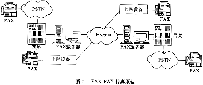 發(fā)送端傳真機(jī)與網(wǎng)關(guān)連接,通過(guò)PSTN傳送傳真,網(wǎng)關(guān)接收傳真后通過(guò)Internet傳至另一端的網(wǎng)關(guān),另一端的網(wǎng)關(guān)再通過(guò)PSTN將傳真發(fā)送給接收端傳真機(jī)。這種方式既適合存儲(chǔ)轉(zhuǎn)發(fā)模式,也適合實(shí)時(shí)模式,因此更加有吸引力。近年來(lái),出現(xiàn)了一種不依賴(lài)網(wǎng)關(guān)的FAX-FAX IP傳真技術(shù),它是利用傳真機(jī)外掛一專(zhuān)用上網(wǎng)設(shè)備直接在Internet網(wǎng)上發(fā)送信息,原理如圖2所示。