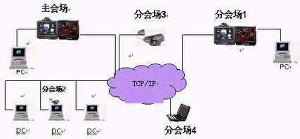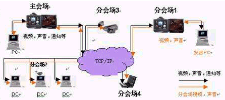 可視化Ip電話會議系統(tǒng): 是利用計算機,多媒體通信技術和設備,通過傳輸信道在兩地或多個地點之間開會的一種通信手段。在召開會議時,處于兩地或不同地點的與會代表,既可以聽到對方的聲音,又可以看到對方的形象,同時還能看到對方會議室的場景,以及在會議中展示的事物、圖片、表格、文件等,縮短了與會代表的距離,使大家好像在同一會議室參加會議一樣。它的廣泛應用必然產(chǎn)生巨大的社會效益和經(jīng)濟效益。系統(tǒng)結構簡圖如下: