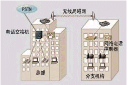 如圖2所示,兩個(gè)辦公樓之間距離較遠(yuǎn),不方便布線,其計(jì)算機(jī)網(wǎng)絡(luò)可以通過(guò)無(wú)線局域網(wǎng)來(lái)連接。在總部已有電話交換機(jī)系統(tǒng),這時(shí)只需在分支機(jī)構(gòu)中增加Cisco網(wǎng)絡(luò)電話控制器,布署IP電話機(jī),然后通過(guò)總部帶語(yǔ)音模塊的Cisco路由器或交換機(jī),接入總部的電話交換機(jī),分支機(jī)構(gòu)就可以享用總部的電話中繼線路,與總部一樣自由地使用電話系統(tǒng)。