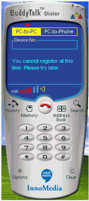 。ㄈ鐖D3),這個就是BuddyTalk的軟件界面。這象不象一個手機?上面的藍色部分是液晶屏。你可以選擇pc-to-pc或者pc-to-phone,下面是用來輸入電話號碼的一個空框,空框下面的部分是軟件顯示提示信息的,再下面是音量大小的顯示器。液晶屏的下面部分跟手機幾乎一樣,其中一個“search”,這是用來上網(wǎng)實現(xiàn)全球用戶數(shù)據(jù)庫搜索,一個“options”,各種設(shè)置可以在這里完成,“Memory”記錄的是你通話信息,以利快速撥號。