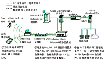 PBX,利用IP將一些遠(yuǎn)程設(shè)備與一臺Nortel的Meridian PBX連接起來,構(gòu)成語音網(wǎng)絡(luò)。在USCUH選擇為醫(yī)護(hù)人員配發(fā)WLAN電話時,兩個網(wǎng)絡(luò)合并到了一起。為保證語音質(zhì)量,醫(yī)院利用SpectraLink的NetLink