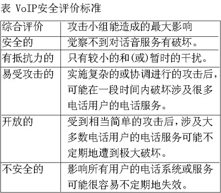 測(cè)試結(jié)果表明,采用了復(fù)雜攻擊手段的攻擊小組無(wú)法破壞思科公司的VoIP網(wǎng)絡(luò),甚至無(wú)法對(duì)其造成顯著的干擾。這套精心制造的IP電話系統(tǒng)(包括第二層和第三層基礎(chǔ)設(shè)施以及各式各樣的附加安全軟件)是“安全的”(參見(jiàn)表中所示的VoIP安全評(píng)價(jià)標(biāo)準(zhǔn)),它最大限度地全面發(fā)揮了思科公司的網(wǎng)絡(luò)安全專(zhuān)長(zhǎng),利用了思科公司擁有的每一種防御武器。