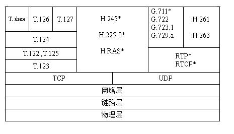 H.323是國際電信聯(lián)盟(ITU)的一個(gè)標(biāo)準(zhǔn)協(xié)議棧,該協(xié)議棧是一個(gè)有機(jī)的整體,根據(jù)功能可以將其分為四類協(xié)議,也就是說該協(xié)議從系統(tǒng)的總體框架(H.323)、視頻編解碼(H.263)、音頻編解碼(H.723.1)、系統(tǒng)控制(H.245)、數(shù)據(jù)流的復(fù)用(H.225)等各方面作了比較祥細(xì)的規(guī)定。