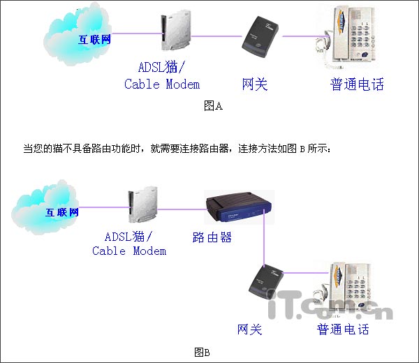 網(wǎng)關(guān)聯(lián)接至RJ45網(wǎng)線(xiàn),普通電話(huà)機(jī)聯(lián)接在PHONE端口,該網(wǎng)關(guān)可通過(guò)市話(huà)線(xiàn)路或網(wǎng)絡(luò)撥打電話(huà),原有市話(huà)線(xiàn)聯(lián)接在PSTN口上,直撥號(hào)碼時(shí)為通過(guò)網(wǎng)絡(luò)撥打,加前置碼#0*通過(guò)原有市話(huà)線(xiàn)撥打,如停電,所有電話(huà)均自動(dòng)從原有市話(huà)線(xiàn)路撥出。