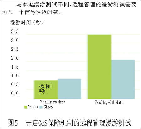 上述操作是為了啟動QoS保障機制后,系統(tǒng)就能取得顯著的成效。但只有Aruba的系統(tǒng)在所有測試中保持了一貫的良好表現(xiàn),在具有QoS保障機制的情況下,甚至在最惡劣的情況下(7個并行VoIP呼叫并加入數(shù)據(jù)流業(yè)務),它仍然能夠傳送出和付費電話通話質(zhì)量一樣的信號。Aruba的系統(tǒng)在打開QoS增強機制的情況下,系統(tǒng)承載業(yè)務最空閑和最繁忙的測試結(jié)果差別很小。
