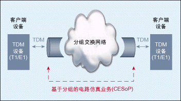 圖1:通過(guò)分組交換網(wǎng)絡(luò)實(shí)現(xiàn)的電路仿真業(yè)務(wù)。