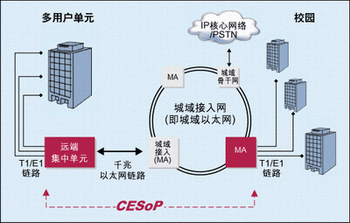對(duì)于擁有眾多用戶的樓宇或校園業(yè)務(wù),運(yùn)營(yíng)商可能需要在靠近客戶的地方裝設(shè)遠(yuǎn)端集中器。遠(yuǎn)端集中器集中提供給該樓宇內(nèi)客戶的TDM和/或分組業(yè)務(wù),使用電路仿真并通過(guò)點(diǎn)到點(diǎn)連接將業(yè)務(wù)傳回最近的城域網(wǎng)絡(luò)接入點(diǎn)。