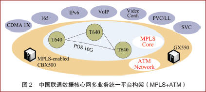 中國(guó)聯(lián)通IP電話網(wǎng)的承載網(wǎng)分為核心層和區(qū)域?qū)觾杉?jí)結(jié)構(gòu),核心層由北京、上海、廣州、沈陽(yáng)、武漢、西安和成都7個(gè)大區(qū)節(jié)點(diǎn)組成;區(qū)域?qū)影锤鞣止緟^(qū)域分布情況,劃分為22個(gè)區(qū)域。建網(wǎng)初期,承載網(wǎng)采用ATM+IP/VPN組成IP電話專(zhuān)用傳輸網(wǎng),確保IP承載層的QoS,網(wǎng)絡(luò)性能符合聯(lián)通測(cè)試指標(biāo)。下一階段,中國(guó)聯(lián)通數(shù)據(jù)核心網(wǎng)的技術(shù)演進(jìn)路線方向如圖2所示。網(wǎng)絡(luò)將以MPLS+ATM為核心技術(shù),在7大核心節(jié)點(diǎn)建設(shè)功能強(qiáng)大的MPLS核心網(wǎng)絡(luò),同時(shí)采用2層MPLS技術(shù),實(shí)現(xiàn)與ATM設(shè)備的透明連接,從而構(gòu)建一個(gè)多協(xié)議、多業(yè)務(wù)同時(shí)兼顧IPv4/IPv6發(fā)展的先進(jìn)網(wǎng)絡(luò)。中國(guó)聯(lián)通的互聯(lián)網(wǎng)、數(shù)據(jù)專(zhuān)線、IP電話、視頻會(huì)議、IPv6網(wǎng)絡(luò)、CDMA1X數(shù)據(jù)通信網(wǎng)等都承載在統(tǒng)一的數(shù)據(jù)傳送平臺(tái)之上。