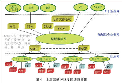 上海聯(lián)通MISN由5個(gè)部分組成(見(jiàn)圖4):(1)業(yè)務(wù)接入控制設(shè)備(SACP)。從用戶(hù)駐地網(wǎng)到城域網(wǎng)和骨務(wù)都必須通過(guò)SACP接的接入認(rèn)證、業(yè)務(wù)接入控制、網(wǎng)絡(luò)資源管理和服務(wù)質(zhì)量控制等。(2)呼叫管理控制模塊(CCM)。該模塊負(fù)責(zé)對(duì)用戶(hù)注冊(cè)的管理;通過(guò)SACP對(duì)業(yè)務(wù)接入進(jìn)行認(rèn)證和控制;與骨干業(yè)務(wù)網(wǎng)GK互通,完成各種業(yè)務(wù)的呼叫控制;與SACP一起采集計(jì)費(fèi)信息;負(fù)責(zé)控制語(yǔ)音和視頻媒體流的接入。(3)業(yè)務(wù)網(wǎng)關(guān)。聯(lián)通MISN是基于IP的分組網(wǎng),與基于電路交換的193長(zhǎng)途電話骨干網(wǎng)和本地PSTN市話網(wǎng)互通時(shí),由于媒體層面和控制信令層面都不同,因此,需要通過(guò)網(wǎng)關(guān)進(jìn)行互通。(4)BRAS設(shè)備。負(fù)責(zé)將互聯(lián)網(wǎng)接入到165網(wǎng)。(5)業(yè)務(wù)運(yùn)營(yíng)支撐系統(tǒng)。該系統(tǒng)包括維護(hù)網(wǎng)管系統(tǒng)、用戶(hù)終端管理系統(tǒng)、用戶(hù)管理(業(yè)務(wù)受理、用戶(hù)信息管理、用戶(hù)業(yè)務(wù)授權(quán)與認(rèn)證)以及本地MISN的計(jì)費(fèi)/營(yíng)賬系統(tǒng),其對(duì)上的接口是各骨干業(yè)務(wù)網(wǎng)的運(yùn)維支撐系統(tǒng)。