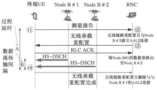 對(duì)于下面的延時(shí)分析,我們假設(shè)信令無線承載(SRB)在下行映射到HS-DSCH信道上,在上行映射到增強(qiáng)上行鏈路專用信道(E-DCH)上,且TTI均為10ms。HS-DSCH是HSDPA的傳輸信道,E-DCH是HSUPA的傳輸信道。首先,當(dāng)滿足測(cè)量觸發(fā)事件1d(最優(yōu)小區(qū)改變)時(shí),UE在信令無線承載上發(fā)送測(cè)量報(bào)告。傳輸從t1開始,RNC在t2時(shí)刻接收到消息。服務(wù)RNC將為目標(biāo)NodeB保留基站資源和Iub資源。該資源的預(yù)留通過使用預(yù)配置可以完成得非常快。一旦資源在t3時(shí)刻準(zhǔn)備好,RNC將向UE發(fā)送無線承載重配置消息,此時(shí)UE還是從源NodeB中接收數(shù)據(jù)。當(dāng)UE對(duì)重配置消息進(jìn)行解碼,并且在有效時(shí)刻t4到期前,UE接收數(shù)據(jù)將從源小區(qū)切換到目標(biāo)小區(qū)。UE開始監(jiān)聽目標(biāo)小區(qū)的高速共享控制信道(HS-SCCH),HS-SCCH是HSDPA下行的共享控制信道。UE也會(huì)測(cè)量目標(biāo)小區(qū)的信道質(zhì)量,并發(fā)送目標(biāo)小區(qū)的CQI報(bào)告。源小區(qū)該用戶的MAC-hs在小區(qū)切換后將重置,并將緩存的協(xié)議數(shù)據(jù)單元(PDU)刪除。同時(shí)目標(biāo)小區(qū)MAC-hs中的流控單元開始從服務(wù)RNC中請(qǐng)求PDU,這樣便可以通過HS-DSCH向用戶發(fā)送數(shù)據(jù)。在小區(qū)切換過程中,RNC可以同時(shí)向兩個(gè)Node