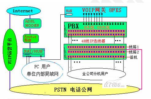 建議采用“EIA2000系列語音網(wǎng)關(guān)”,有單口、2口、4口、8口、16口等設(shè)備,可供選擇。所謂4口,即每設(shè)備有4個通訊接口,可4路同時通話,公司內(nèi)部電話通過集團交換機接入語音網(wǎng)關(guān),且可新增網(wǎng)關(guān)自由擴展。端口建議選擇全FXS口接入,每路雙向通話需要占用大約10-12KB,在實際使用中,每條ADSL線路可供10路同時通話,實現(xiàn)多人共享使用(在沒有大量數(shù)據(jù)傳輸?shù)那闆r下)。