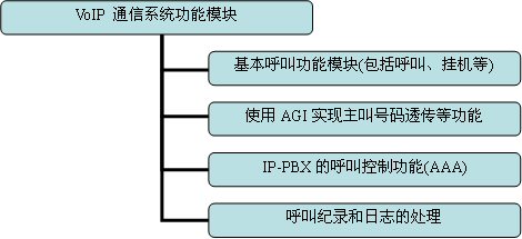 如果是基于純軟件的實現(xiàn)方案,Asterisk是構建VoIP項目的核心,系統(tǒng)中所有與用戶呼叫有關的功能和管理都通過它來實現(xiàn),包括VoIP各種協(xié)議的互通和配置,以及各種呼叫設備的配置文件。本文檔所討論的VoIP通信系統(tǒng)基本功能如圖3-2所示,一般的Asterisk的任務包括了兩方面,一是與呼叫有關的,包括基本呼叫處理、主叫號碼透傳、呼叫紀錄和日志生成等,二是與呼叫控制有關,即終端用戶的認證計費功能。