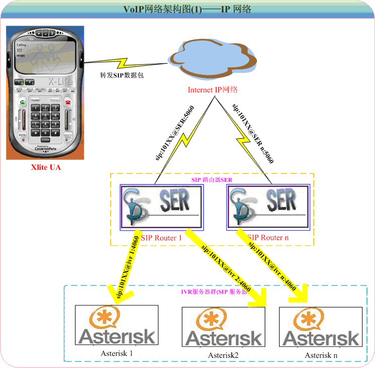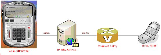 1.VoIP軟終端X-Lite,對應圖4-1的PC PHONE:PC用戶使用SIP軟終端(目前只使SIP協(xié)議作為輸入信令)訪問IP-PBX服務器軟交換后臺,對普通座機或手機發(fā)起呼叫,實現(xiàn)PC2Phone的通訊。