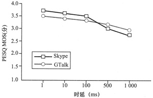ms、100 ms時Skype的PESQ MOS高于GTalk,在時延為500 ms、1 000 ms時GTalk則略優(yōu)于Skype。